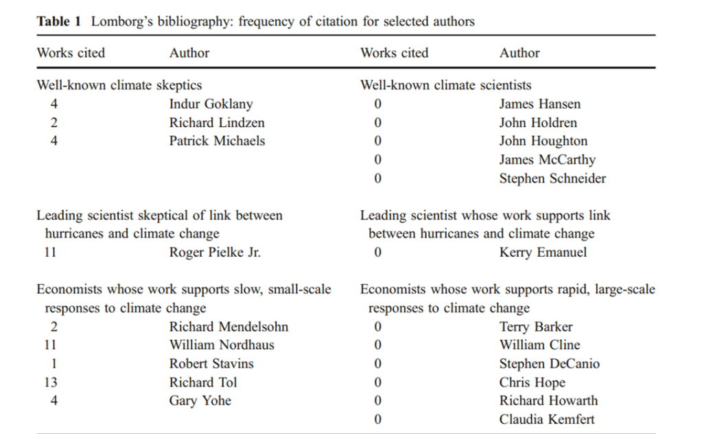Denna tabell är från Ackerman-referensen ovan och visar vilkas studier Lomborg valt att ta med eller inte: