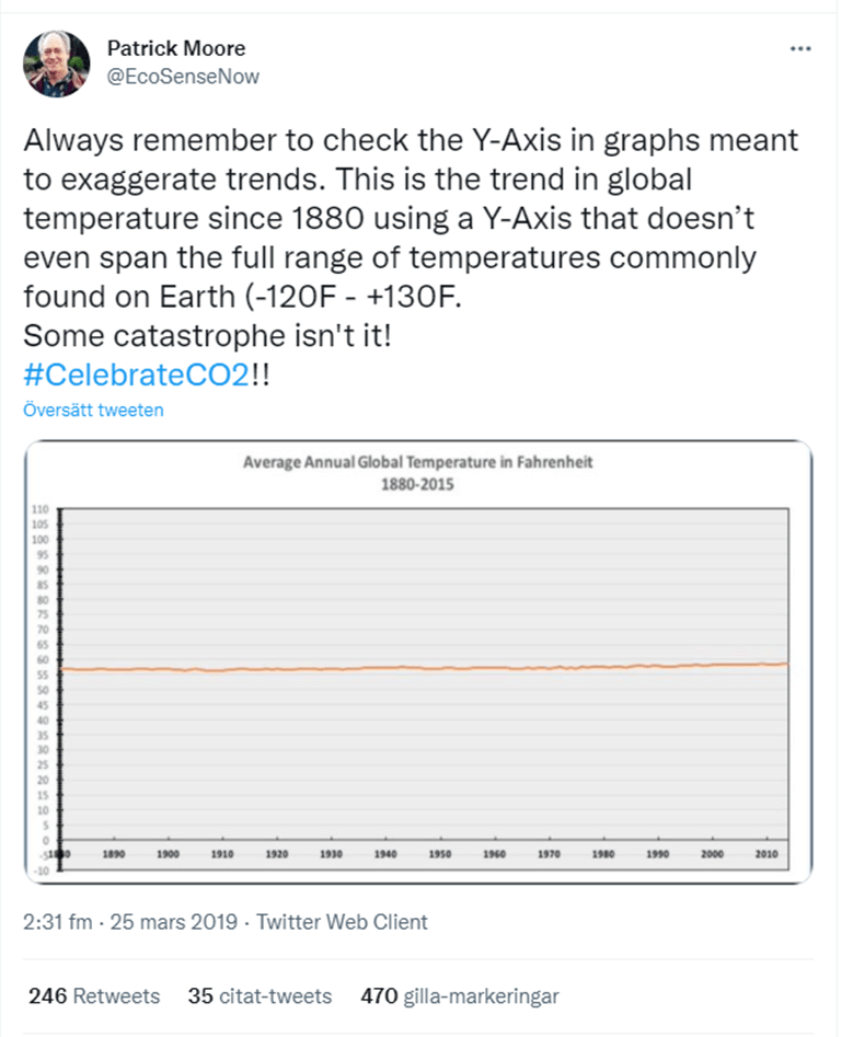 1. Man måste anpassa axlarna efter vad som ska visas i grafen. Moore har satt värdet till -84C upp till +54C, vilket är helt irrelevant i sammanhanget. Grafen visar jordens medeltemperatur och den har som bekant ökat lite drygt 1C under den visade tiden, och vi pratar om vådan att nå 2-4C. I hans utzoomade skala skulle inte ens senaste istiden (ca 6C lägre än nu) synas. En ökad medeltemp på +/-20C är t ex helt vansinniga siffor bara det. Men det är ingen slump att han gör så här, han är en propagandaist så det står härliga till och vet precis vad han gör https://mathsnilsson.se/2020/04/28/klimatet-har-alltid-varierat-variant-x/