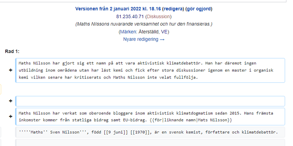 Beskrev i föregående inlägg hur Widding la ut rena lögner om mig på sin blogg (läs: Så här sjuk är ”klimatdebatten”). Förutom om att vara psykiskt sjuk skulle jag även hålla på att manipulera hennes Wikipediasida och allt vad det var. Kollade igår av ren nyfikenhet på historiken på Wikipedias sida om mig. En stjärna från Skogås hade lagt in nedanstående text (vilket senare hade tagits bort av Wikis ”renhållningsarbetare”. Tack.)
