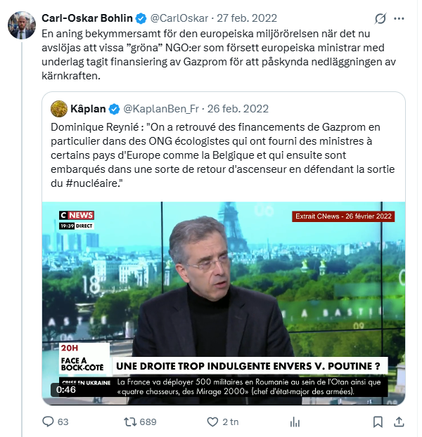 Nu kan jag inte franska men enligt Twitterinlägg säger han att Gazprom har finansierat olika miljöorganisationer som i sin tur har backat ministrar inom EU som jobbat för nedläggning av kärnkraft.