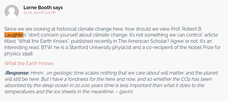 Han menar att eftersom haven kommer absorbera koldioxiden inom några tiotusentals år så är det inga problem. Klimatforskarna är, föga förvånande, föga imponerade av Laughlins uttalanden. Här svar från NASA-forskaren Gavin Schmidt på fråga: