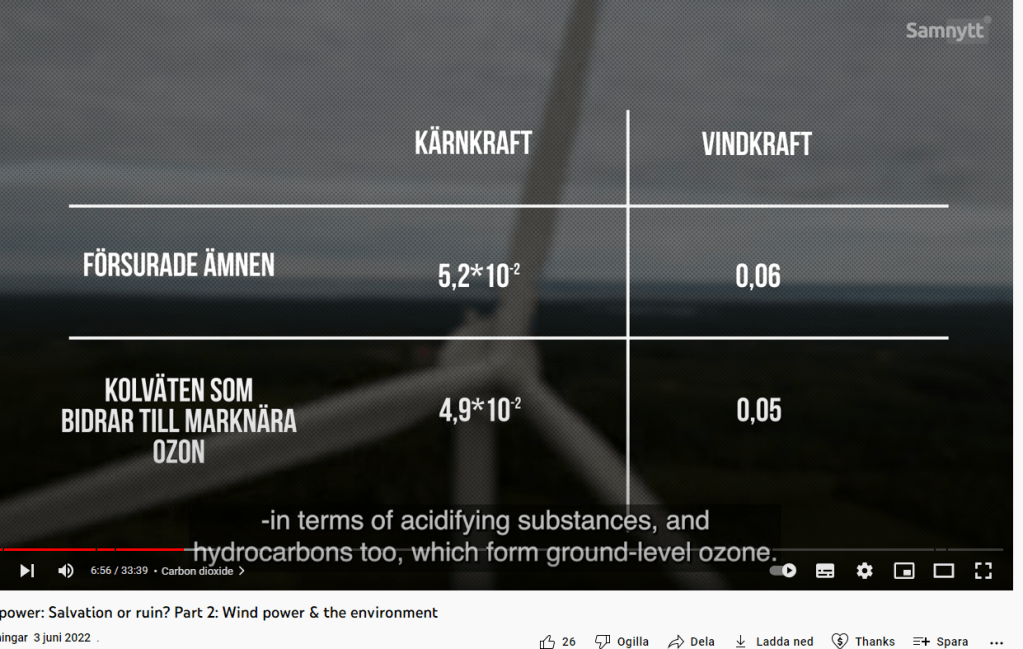 [Uppdatering 3 juni: När man tittat på en Youtubefilm blir man matad med liknande. Såg att Samnytt idag lagt upp en engelsk version av del 2 av sin vindkraftsdokumentär. Jag började titta men det blev snart tydligt att det var en ren propagandafilm och när nedanstående tabell dök upp fick det vara nog. De jämför kärnkraft och vindkraft och vill visa att vindkraften släpper ut mer kolväten och försurande ämnen: