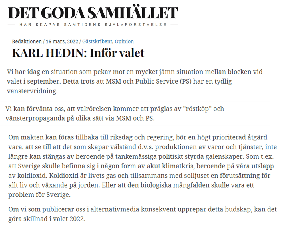I väldigt många insändare och artiklar hittas välbekanta signalord som ”statsmedia”, ”vänstervridning” och diverse hånfullheter mot journalister, miljörörelse och MP. Klimathotet spelas ner ordentligt av många. Här några klipp från en debattartikel skriven av sagde Karl Hedin: