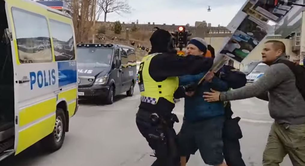 … och lägger till texten: ”Såvitt jag förstått behöver man inget tillstånd för att vandra omkring med skyltar så länge man inte stör trafik eller annat. Rätten att demonstrera är fäst i grundlagen. Många poliser är engagerade i ingripandet. Man måste fråga sig vad som motiverat en så omfattande mobilisering. I gasmasker. Jag undrar hur man får anständiga svenska poliser att göra så.”