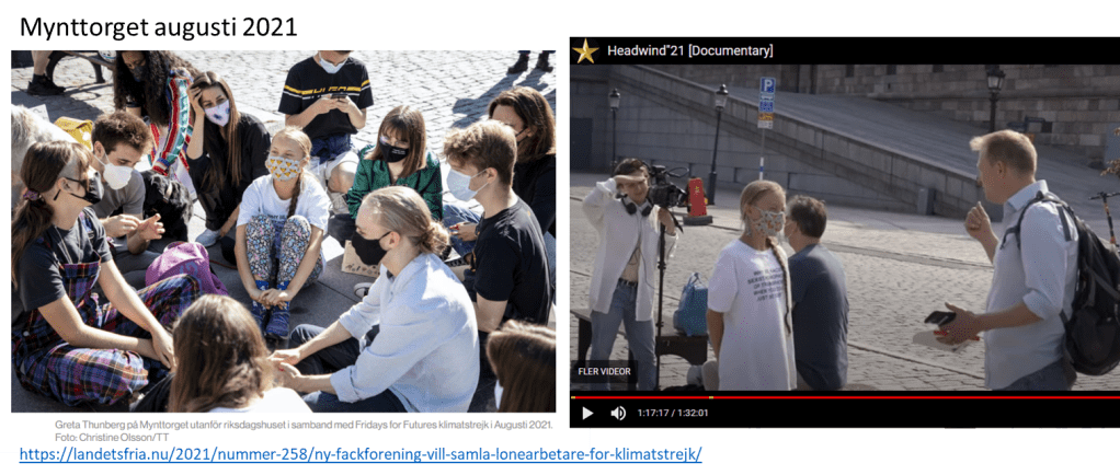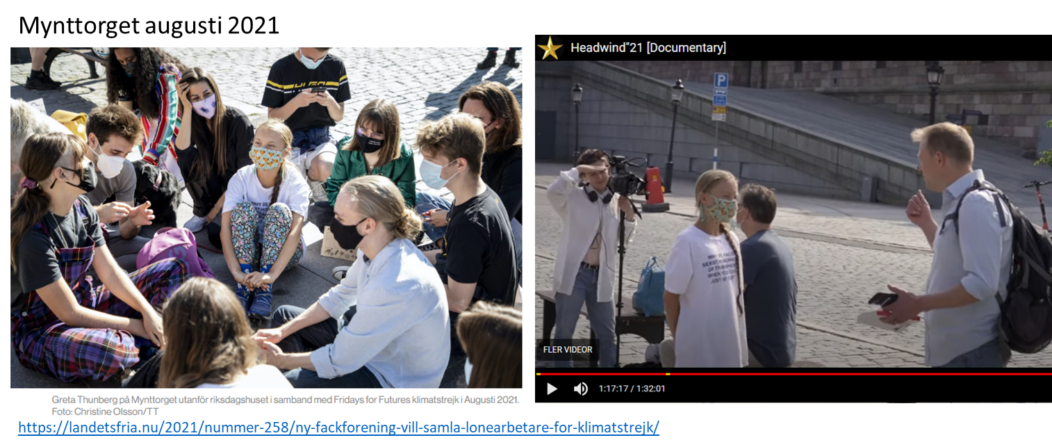 Och Greta då? Jo, i filmen stod hon iklädd kortärmat (bild till höger nedan), knappast i mars va? En snabb googling ger att hon vid protest i augusti 2021 bar samma t-shirt och samma munskydd (bild till vänster nedan) som i intervjun i Headwind ’21 – samma tillfälle alltså. Det rådde inte förbud mot folksamlingar då. En ”detalj” som aldrig nämns och det kan inte vara annat än avsiktligt.