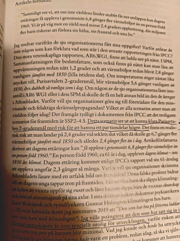 Hon påstår att jag tar saker ur sitt sammanhang när jag kommenterar att hon anger IPCC:s klimatscenario SSP2-4.5 felaktigt. Här är foto på denna sida: