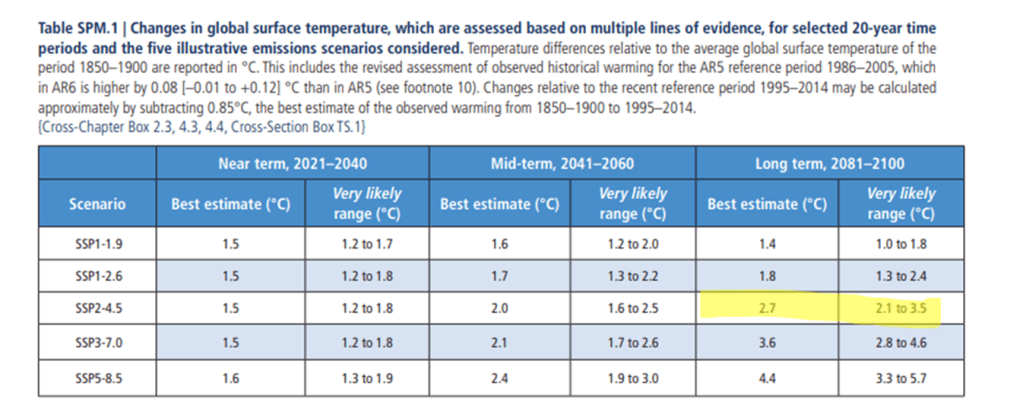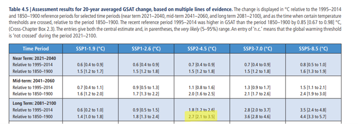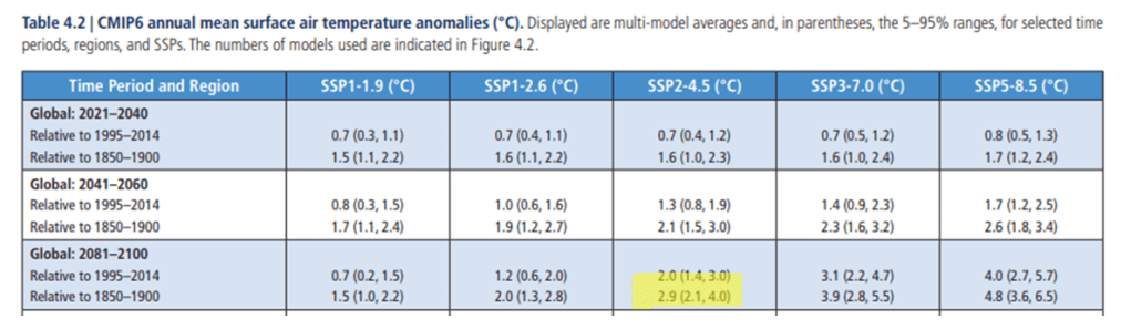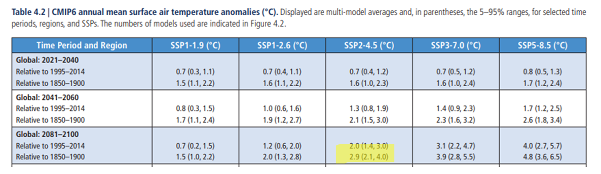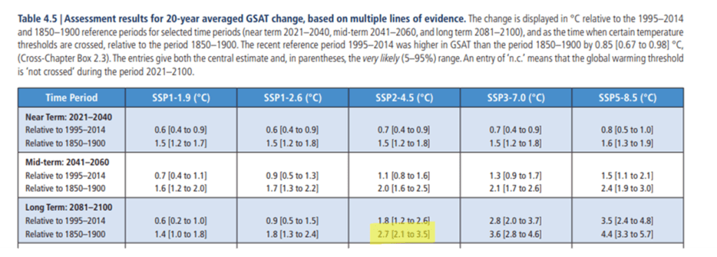 Hon anger att scenariot kan uppnå Parisavtalet (dvs <2C) med risk att hamna några tiondelar över. Det stämmer alltså inte då(rätt intervall för SSP2-4.5 är 2,1-3,5C vid år 2100. Widdings försvar är typ att ”jag skrev ju rätt på andra ställen i boken”. För visst visar hon tabellen från Sammanfattning för beslutsfattare (SPM) på annat ställe i boken: