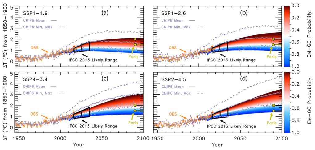 EW hänvisar vidare till en studie Comparison of CMIP6 historical climate simulations and future projected warming to an empirical model of global climate som gjort simuleringar utifrån andra parametrar för aerosolpåverkan än de i CMIP6-modelleringarna. Det är en studie och fortfarande inte vad SSP2-4.5 visar (det är enligt detta utsläppsscenariot men modellen är ”EC-GM trained” som det anges i artikeln). Och det försvarar fortfarande inte varför hon utelämnar de övre riskgränserna (längst ner till höger).