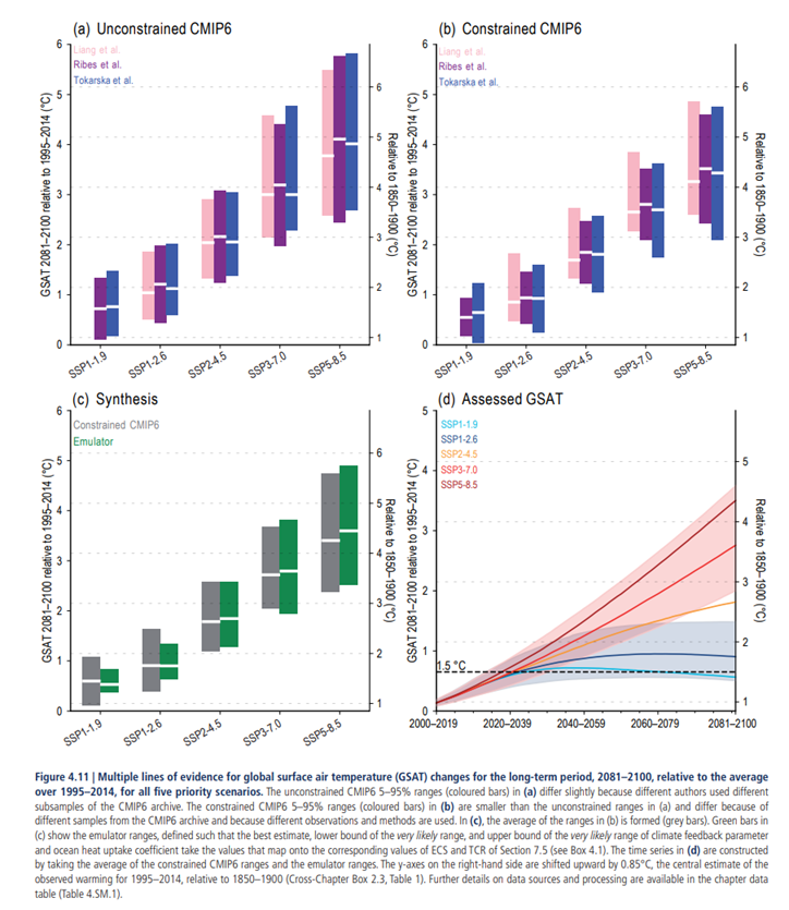 Här är ytterligare en bild från IPCC AR6 som visar skillnaderna (contrained är alltså de ”viktade modellresultaten”):