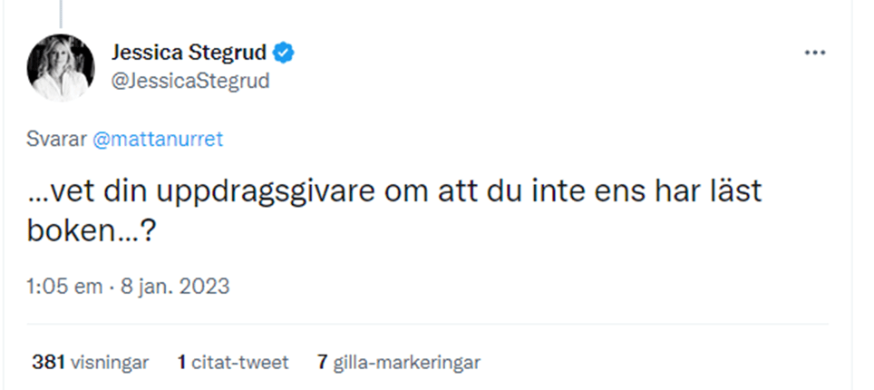 Sen följer beskyllningar att jag inte läst hennes bok och att jag är för dum i huvudet för att fatta det hon skrivit. Titta gärna, jag lägger upp videon längst ner i detta inlägg.