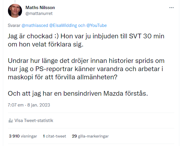 Det var förstås inte oväntat att det skulle bli liv i luckan efter min recension av Elsa Widdings ”klimatbok”. Jessica Stegrud (riksdagskollega med EW) verkar ha som ryggmärgsreflex att ljuga, hennes kommentar var denna: