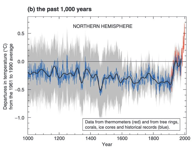 Egentligen var det kanske deras kompletterande studie ett år senare som blev känd, den sträckte sig 1000 år tillbaka och fanns med i IPCC:s tredje stora assessment report 2001. Den numera ikoniska grafen såg ut så här i Summary for policymakers: