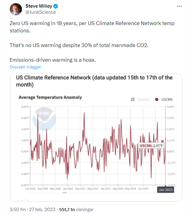 Jaja, den här diskussionen kommer aldrig ta slut. Som sagt, läs mer på The Climate Brink. Lite kul är det att både Milloy och Shewchuk har skrivit på Clintels upprop ”Det finns ingen klimatkris” vars första punkt proklamerar att det inte är förvånande att vi nu ser en uppvärmning (men det ska förstås då bara handla om naturliga cykler):