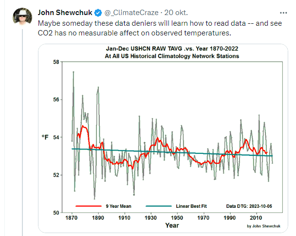 Här ett inlägg från John Shewchuk från CO2 Coalition, en av de mer aktiva förvillarorganisationerna, där han påpekar att CO2 inte har någon märkbar effekt på observerad temperatur. Som synes visar grafen på en avkylning.