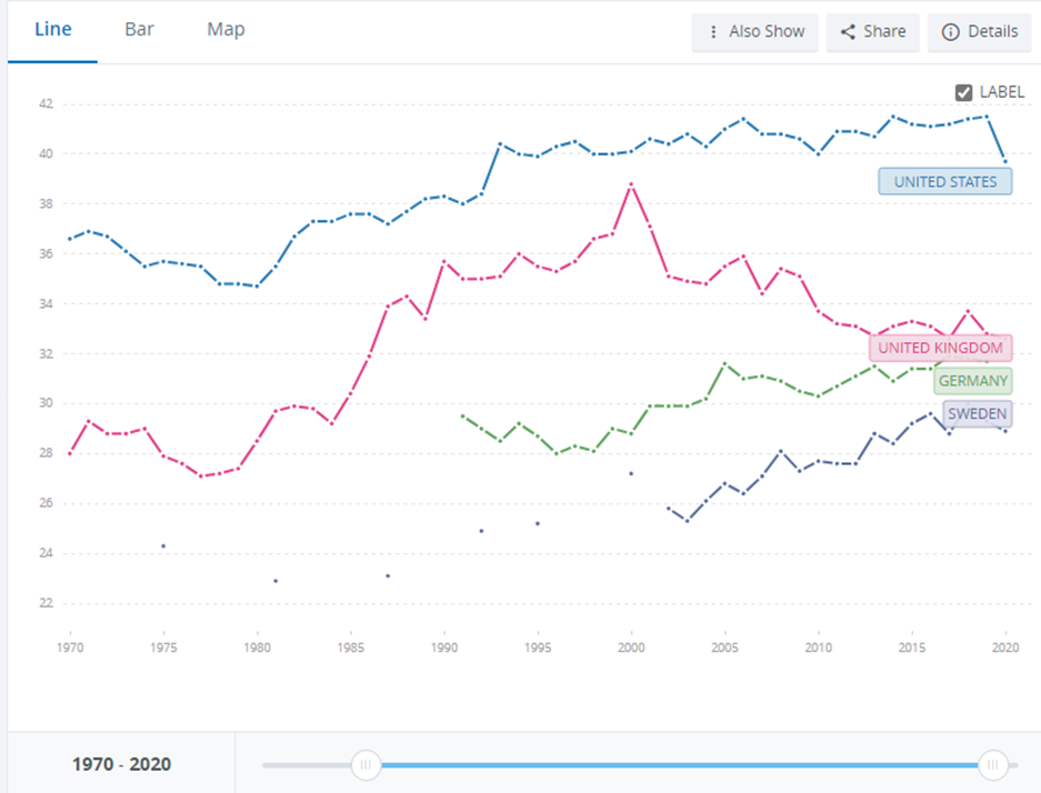 Bild: GINI-koefficienten mellan 1970–2020. Thatcher regerade mellan 1979–1990 och Reagan 1981–1989 (data från Världsbanken)