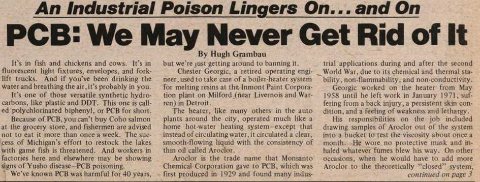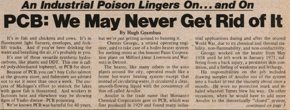 [2] Grambau, Hugh, An Industrial Poison Lingers On…and On PCB: We May Never Get Rid of It Ann Arbor Sun, 1976-03-25 https://aadl.org/node/201014
