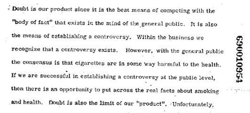 I ett numera klassiskt memo från tobaksbolagen 1969 när de anklagades för att sälja hälsofarliga produkter, formulerades deras strategi att bemöta detta med orden: Doubt is our product (tvivel är vår produkt).[15]
