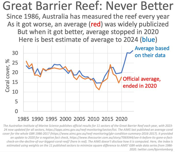Igår såg jag att opinionsbildaren Lomborg lagt upp en graf som visade att korallerna på Stora barriärrevet utanför Australiens kust faktiskt frodades bättre än någonsin. På Twitter skrev han om revets koralltäckning: ”Last three years, 2022-2024, have been unprecedented.” Han bifogade också en illa dold anklagelse om att forskarna mörkade data genom att inte redovisa sådant som tydde på positiva tendenser: