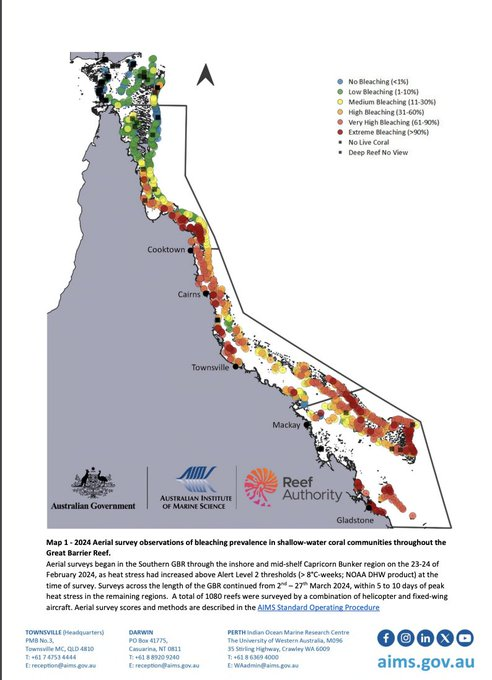 Enligt de preliminära resultaten från övervakningen 2024 var årets blekning den allvarligaste hittills och för första gången har man sett både blekning och döda koraller inom Stora barriärrevets alla tre delar, dvs norra, centrala och södra delarna.