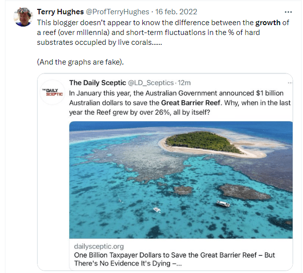 Lomborg hänvisar för övrigt även till Peter Ridd, tidigare professor vid James Cook universitet som menar att det stora barriärrevet inte alls är i någon fara och att korallblekningarna inte är något att oroa sig för. Även han visar en graf med en nästan rekordstor koralltäckning (men han skriver också att mycket av den data som ingår i senaste undersökningen är från innan årets blekningshändelse). Ridd menar att oavsett om det bara är en typ av snabbväxande koraller som står för tillväxten så visar det på att ”mainstream forskare” haft fel.