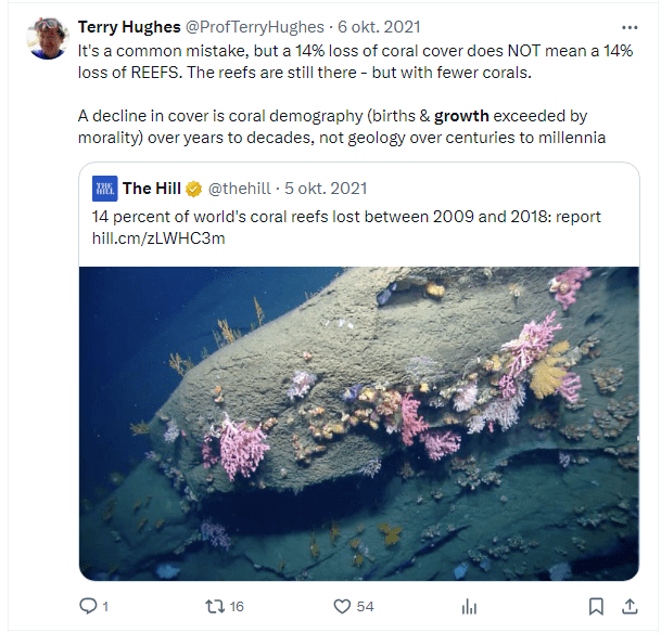 Jag är förstås en tokamatör på korallreven, samtidigt känns det lite väl överslätande att hävda att allt är frid och fröjd för att en sorts koraller växer till medan det bevisligen sker allt allvarligare blekningar, sjunkande pH i haven, allt varmare hav och så vidare. Ingen skulle väl komma på tanken att hävda att fisksituationen i Östersjön är oproblematisk med enda bevis att spiggbestånden har vuxit närmast okontrollerat?