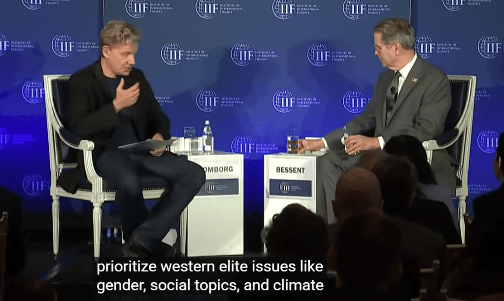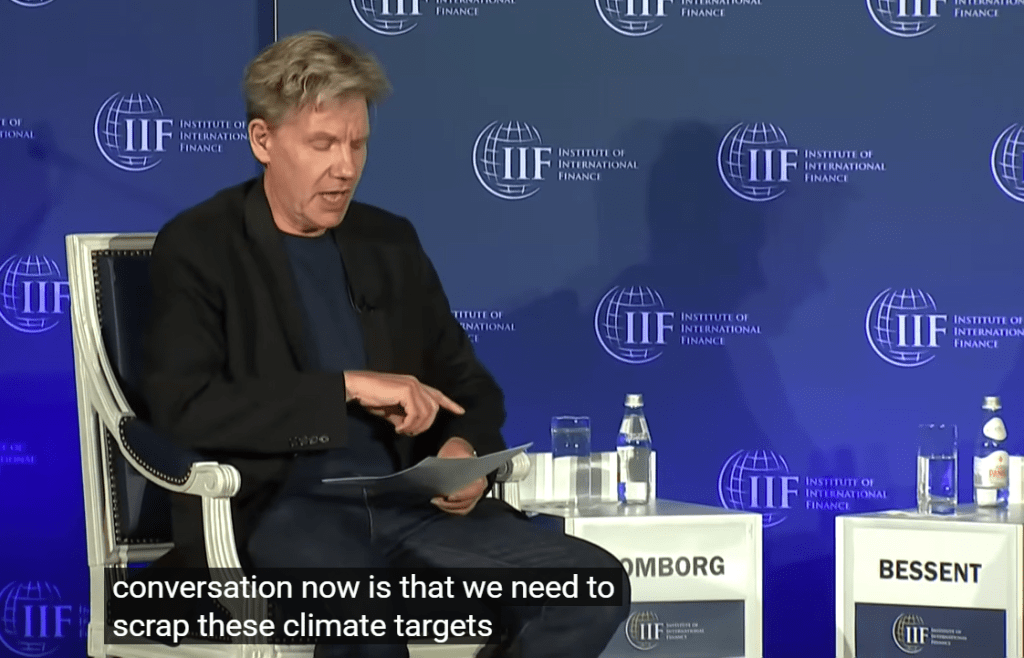 Igår (14 juni 2026) satt opinionsbildaren Bjørn Lomborg och USA:s finansminister Scott Bessent på en scen och diskuterade, eller snarare kritiserade, Internationella valutafondens (IMF) och Världsbankens prioriteringar. Samtalet är i princip en enda tirad av motstånd till klimatåtgärder och de båda herrarna illustrerar tydligt anledningen till att klimatomställningen går trögt.