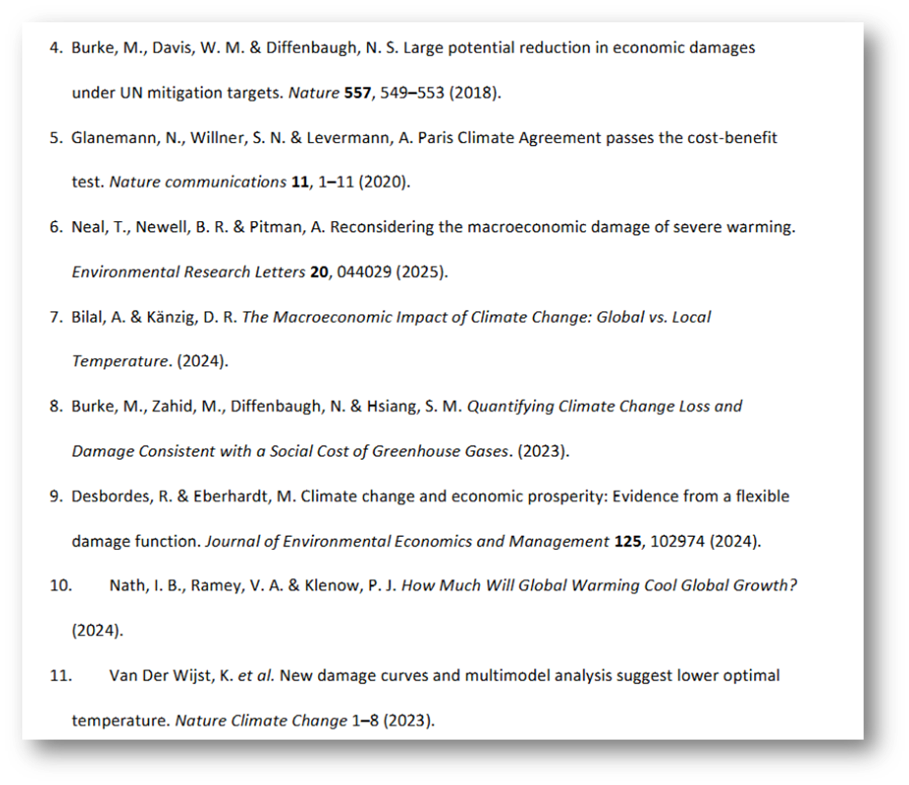 När Reagan tillträdde som president införde han krav på att alla miljöåtgärder skulle genomgå en cost-benefit-analys innan de ens kom på tal. Det verkar vara ett heligt mantra för dem inom den nyliberala ekonomi, och Lomborg är inget undantag. På scenen säger Scott Bessent att all ”klimatpanik” byggde på en alarmistisk studie publicerad i Nature 2024 som spådde att klimatförändringarna skulle kosta enormt mycket mer än vad en omställning skulle innebära. Bessent och Lomborg påpekar att studien var felaktig och har dragits tillbaka.