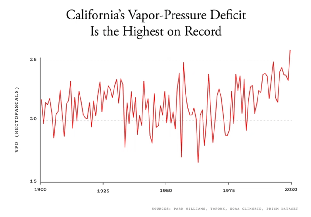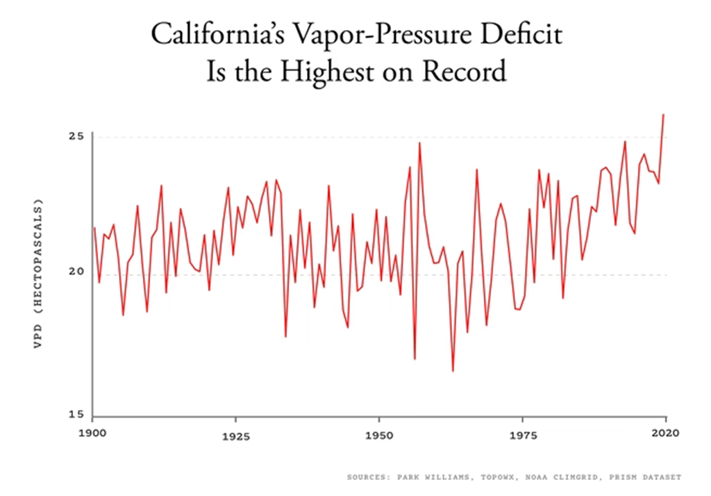 Men här är en studie som visade att den ökade VPD:n ligger bakom den ökade areal som drabbas av skogsbränder i Kalifornien mellan 1972-2018: