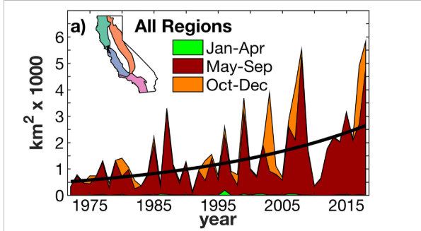 ”The above results strongly suggest that the observed increase in California summer burned area during 1972–2018 (which mainly occurred in northern California forests) was mainly due to increased VPD and not concurrent changes in nonclimate factors such as forest management, fire suppression practices, or human ignitions.