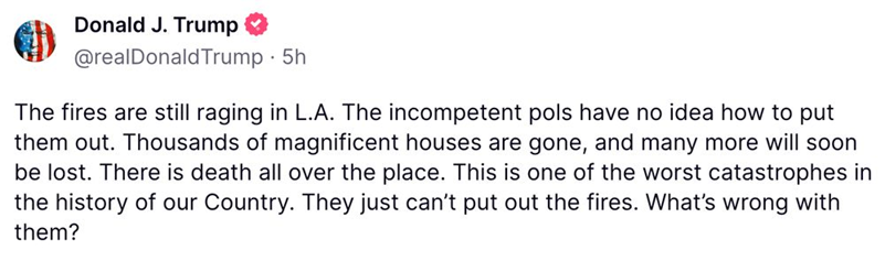 Ingen kan ha missat katastrofläget i Los Angeles och det är nästan en självklarhet att skiten börjar flöda på nätet inom loppet av ingen tid alls. Republikanska medieapparaten, amplifierat av Musk och Trump, har redan bestämt sig: brandförsvaret har prioriterat ”wokegrejor” som jämställdhet och hbtq-frågor istället för kärnuppgiften att släcka bränder.