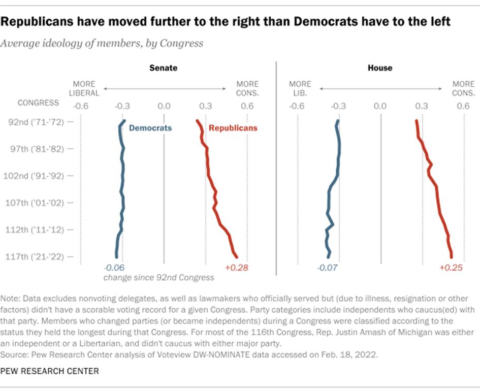 Och ja, det är högern som har valsat längre ut på kanten, se exempelvis nedanstående undersökning i USA. Det mest problematiska är kanske ändå att det knappt inte finns något överlapp mellan republikaner och demokrater och viljan/förmågan till kompromisser är helt borta. Och det är en process som inte gått över en natt.
