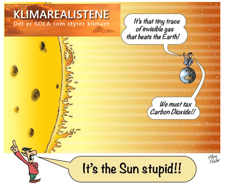 It’s the Sun stupid! (Det är solen, idiot) är en parafras på en av Clintons valslogans It’s the economy stupid! (först tänkt som en ”instruktion” till sina egna valarbetare men det spred sig och användes sen även externt). Astrofysikern Willie Soon, är en av de mest aktiva ”klimathotsskeptikerna” och han använde It’s the Sun stupid! som rubrik i en av sina artiklar.