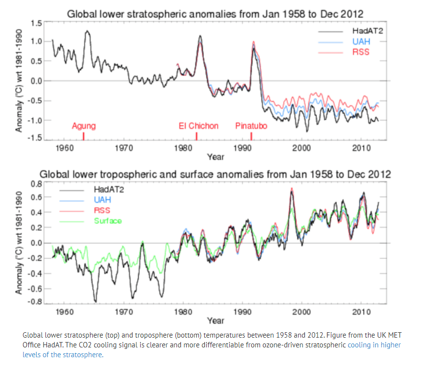 Ett andra tecken som visar att det är växthusgaser och inte en ökad solinstrålning som ligger bakom uppvärmningen, är vad som brukar kallas växthuseffektens fingeravtryck: stratosfären kyls ner. Forskarna anser att den inte skulle göra det om uppvärmningen var orsakad av en ökad solinstrålning. Detta förutspåddes för länge sedan av Nobelpristagaren Manabe (och Wetherald 1967). En del av detta beror också på en minskad halt av ozon i stratosfären. Men fysiken får ni diskutera med de som forskar om saken.