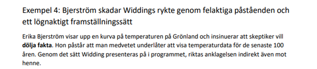 sid 230: Kurt Wahlstedt (psykiater) och Gunnar Holmgren (civ ingenjör) skriver ett kapitel: ”Man tar också forskaren Michael Mann i försvar och beklagar att han blivit utsatt för stark kritik utan att ta upp att det beror på att hans ”Hockey stick” inte stämmer med sedan lång tid etablerad temperaturhistorik och att han vägrat dela med sig av grunddata med motivationen att de är privata.”