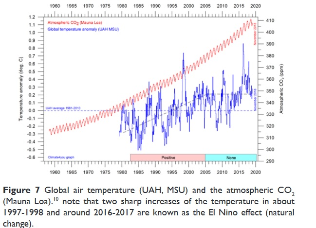 Notera den fantasifullt dragna regressionslinjen i temperaturserien (blåa streckade linjen), uppvärmning fram till 2004 och sen en helt vågrätt linje. I mina ögon är det faktiskt ganska bisarrt att gamla akademiker med professorstitel kan sprida sånt här. Men vad vet jag.