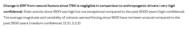 Han köper inte heller IPCC:s slutsatser om att mänskliga aktiviteter och koldioxidutsläpp är den absoluta huvudorsaken till den uppvärmning som observerats. Det kan man inte riktigt veta hävdar han… Visst finns det osäkerheter men i senaste IPCC-rapporten konstaterades att de ”drivkraften” från de naturliga parametrarna var försumbara jämfört med de antropogena (ERF = effective radiative forcing).