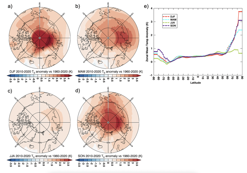 Seasonal anomalies of 2010-20 Arctic surface temperature relative to 1960-2020 and zonal surface temperature anomalies for each season. DJF and JJA (left-hand maps) correspond to the northern hemisphere winter and summer, respectively. MAM and SON (right-hand maps) correspond to the northern hemisphere spring and autumn, respectively. The chart shows the temperature anomaly by latitude for each season – winter (red), spring (blue), summer (green) and autumn (purple). Credit: Data from GISTEMP. Figure from Taylor et al (2022).