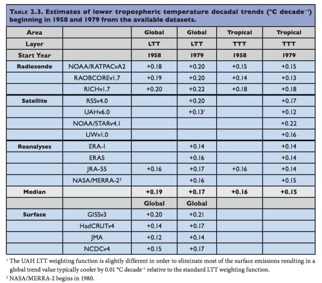 Den här typen av diskussioner är standard i forskningsfronten, oavsett område. Så motbevisar osäkerheterna en växthusgasdriven uppvärmning? Nej, inte alls. Hot spoten förväntas som sagt uppstå oavsett vad som orsakar jordytans uppvärmning. Att jordytan värms upp är odiskutabel (och där presterar också modellerna bra). Likaså visar mätningarna att stratosfären kyls av precis som förväntat (växthuseffektens ”fingeravtryck”). Alla mätserier från troposfären visar en uppvärmning, det är bara hastigheten som skiljer, här från BAMS 2018 (Både Mears och Christy var författare till detta kapitel):