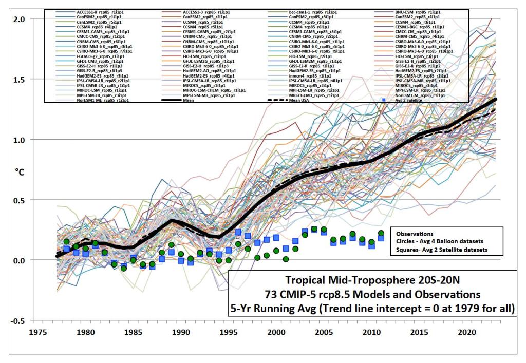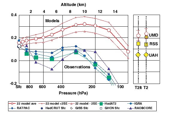 Det märks en tydlig skillnad i deras argumentation. ”IPCC-kritiska” Christy tycks vara ganska säker på att observationerna är tillförlitliga och fokuserar på att visa att modellerna är felaktiga i sin bedömning av hur den tropiska atmosfären ska värmas upp. Han menar därför att klimatmodeller generellt inte bör användas för att sätta någon politisk policy hur ”mänskligheten” ska agera. Han visar hur modeller och mätningar skiljer sig åt med bl a följande bild: