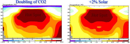 Till att börja med: the tropical hot spot är INTE specifik för en växthusgasdriven uppvärmning, den förväntas uppstå oavsett vad uppvärmningen beror på. I bilderna nedan visas modellkörningar från växthusgas- respektive enbart ”soldriven” uppvärmning, x-axeln visar bredddgraden, det vill säga mitten motsvarar ekvatorn och hörnen polerna, y-axeln är höjden i atmosfären):