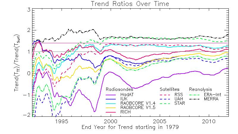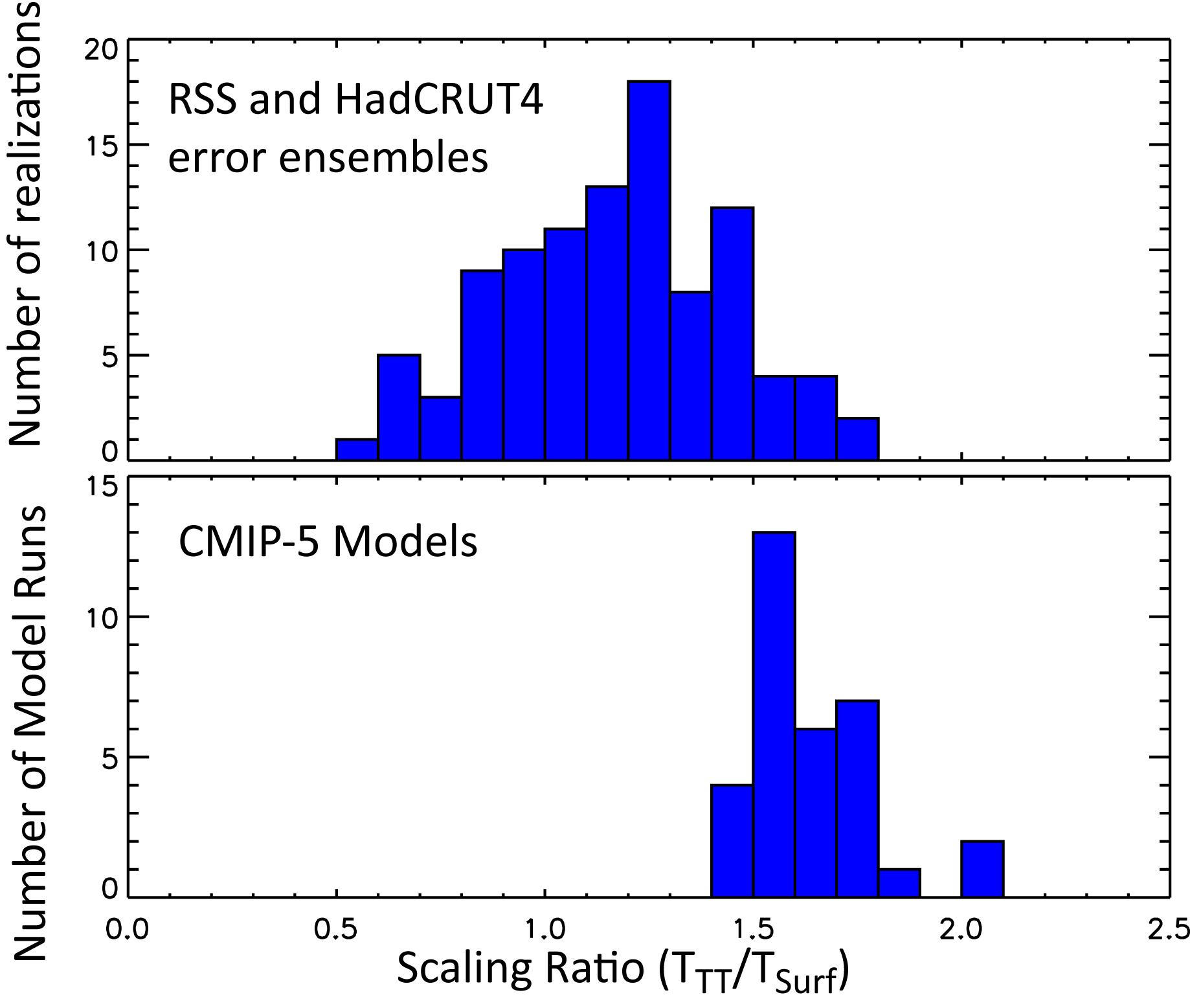 Översta bilden visar observationer och nedersta visar modellerna som användes till IPCC rapporten AR5 från 2013. Enligt modellerna ska troposfären värmas upp ca 1,4 gånger snabbare än jordytan, det är vad som menas med ”Scaling ratio” på x–axeln. Så felmarginalerna överlappar. Mears slutsats är dock att det finns så stora osäkerheter i både mätningar och modeller att det varken går att bevisa eller motbevisa huruvida det finns en tropisk hot spot eller inte.