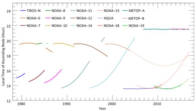 Bild: De satelliter som använts i mätningarna och hur tidpunkten för varje mätning för respektive punkt på jorden drivit med tiden:
