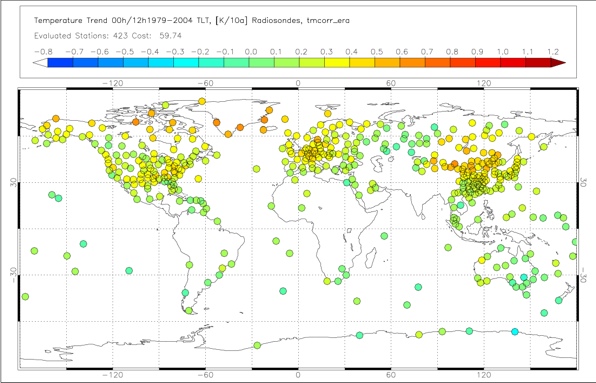 Bilden är från Real Climate, som också påpekar att instrumenteringen har ändrats många gånger och att det finns många kända felkällor som kan vara svåra att korrigera för (exempelvis värmer solen då mätningar görs under dagtid). Det har gjorts, och görs, många försök att korrigera för felkällor i dessa mätningar. Det brukar kallas homogenisering av data och ja, alla gör det, även IPCC-kritiska forskare som Christy och Spencer. En del av den kritik som fördes fram mot Douglass artikel nämnd ovan var att de inte ens nämnt de senaste studierna i detta avseende, trots att de bevisligen var medvetna om dem. Likaså att de inte redovisat alla tillgängliga mätserier.