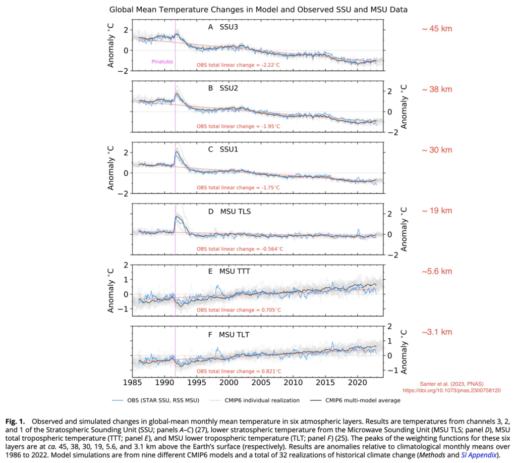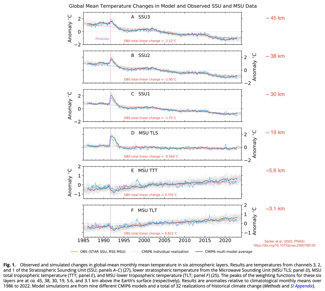 - Idag är koldioxidens ökande växthuseffekt inte bara en hypotes från teoretiska modeller (vilket ofta påstås). Den är även empiriskt uppmätt, både vid jordytan (Feldman et al 2015) och globalt via satellit (Kramer et al 2021) . Redan 1967 publicerade Manabe (som fick Nobelpriset i fysik 2021) och en kollega en studie om det som kommit att kallas växthuseffektens fingeravtryck, nämligen att en ökad halt växthusgaser ger en uppvärmning av nedre delen av atmosfären (troposfären) men däremot en nedkylning av den övre (stratosfären) (Manabe et al 1967). Denna effekt är empiriskt bekräftad (Santer et al 2023). Om en ökad solinstrålning vore orsaken till uppvärmningen förväntas däremot även stratosfären att värmas upp. Men det är ändå bara några av de mängder av pusselbitar som utgör helheten.
