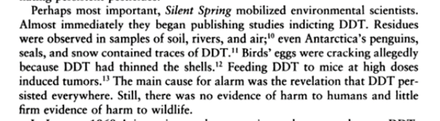 Allt med fokus på att det skulle vara USA:s förbud mot DDT för jordbruk 1972 som bar skulden. Som i sin tur skulle bero på Rachel Carsons bok Tyst vår – inte på den verkliga orsaken, det vill säga slutsatserna från de åtminstone fyra vetenskapliga kommissioner som utrett frågan åt USA:s administration innan.
