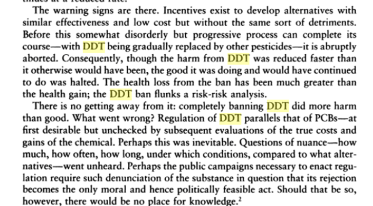 Om du tycker klimatvetenskapen är kladdig och svår att greppa så är den om riskklassningen av kemikalier en bottenlös dypöl, fullt med studier av vitt skilda kvalitet med svår/tve-tvetydiga resultat. Och visst finns det även miljöaktivister som ser väldigt svart-vitt på saker som i verkligheten är väldigt gråa… Säkerligen har DDT:s ”dåliga rykte” i vissa fall överdrivits och fått konsekvenser som skulle kunnat undvikas.