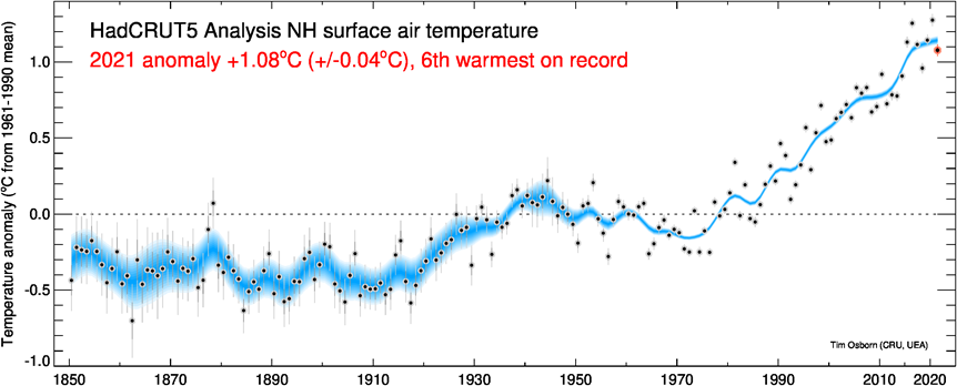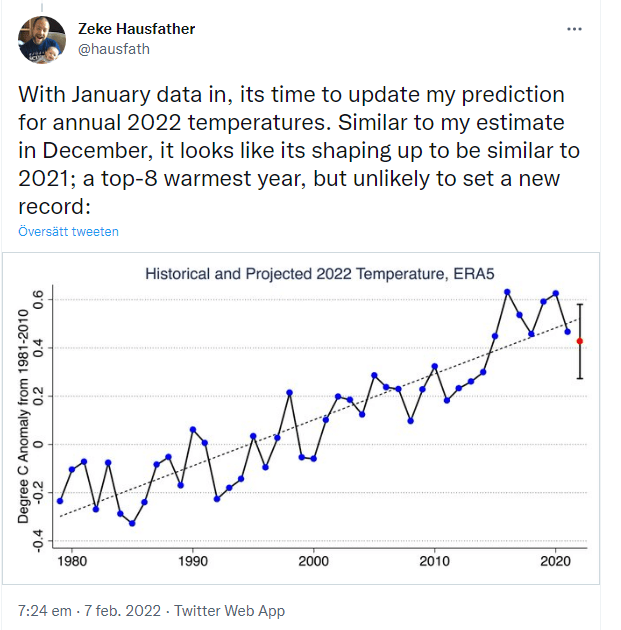 Det alltså inte så att forskarna förbryllat kliar sig i huvudet och undrar varför 2021 inte blev ännu ett rekordvarmt år. (Några brukar för övrigt redovisa en spådom över det kommande året och eftersom vi fortfarande ligger kvar (vad jag vet) i La Niña verkar få tro att 2022 kommer bli ett ”rekordår” vad det gäller medeltemperaturen.):