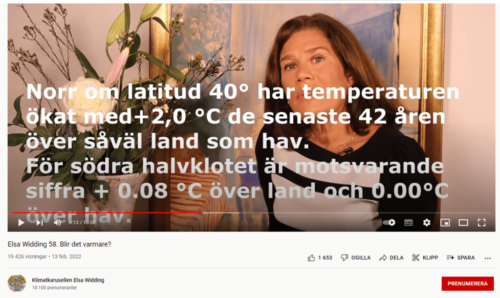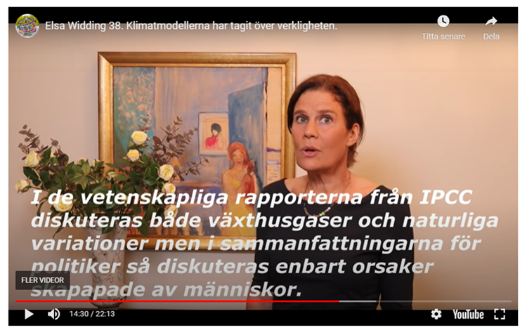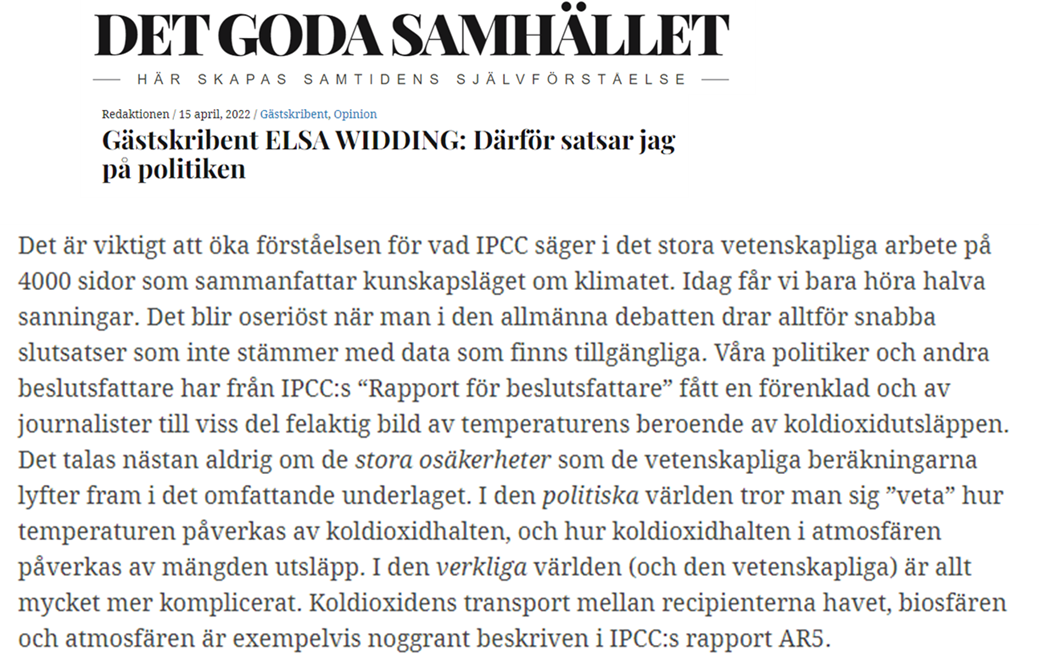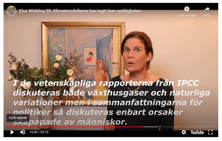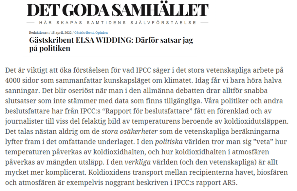 Riksdagsledamoten Elsa Widding (SD) väckte uppmärksamhet när hon nyligen påstod att det inte fanns vetenskapliga bevis för en rådande klimatkris. De som följt debatten blev dock inte förvånade. Hon har skrivit en bok i ämnet och har en egen Yotubekanal där hon ofta framfört åsikter som går på tvärs med IPCC:s slutsatser. I flera intervjuer har hon hävdat att koldioxidhypotesen inte är bevisad.