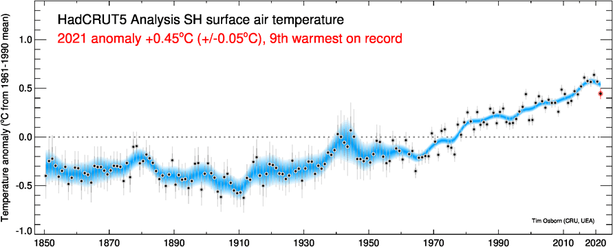 Visst skiljer sig SH och NH åt, framförallt beroende på att SH utgörs av betydligt större ytor med hav. Men uppvärmningstrenden är tydlig för båda halvorna (notera att referensperioden är 1961-1990 och inte från den ofta använda förindustriella tiden):