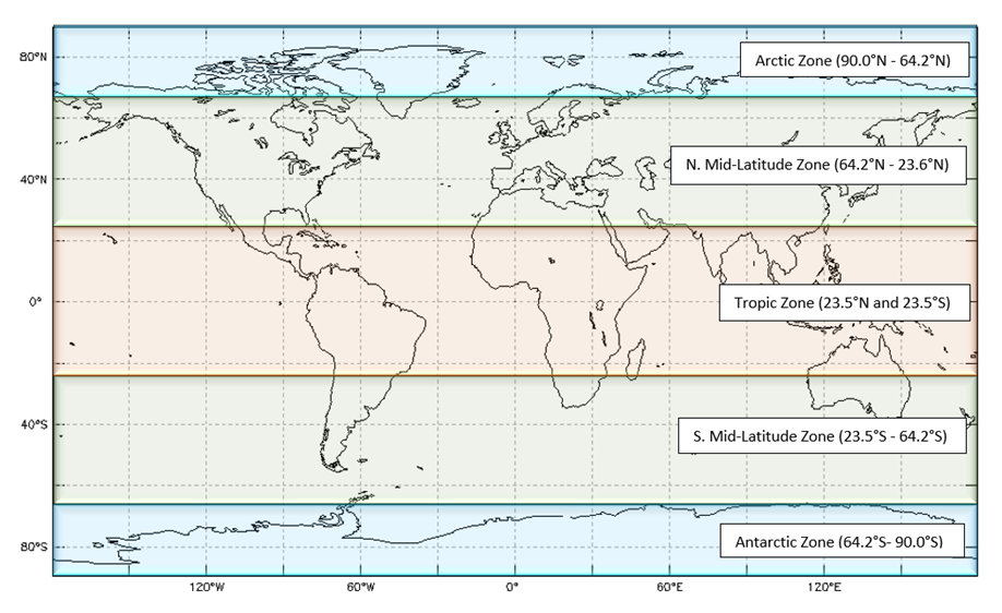 Men det är ju inte vad Widding har skrivit och det beror som synes på att hon har valt ett snävare område, nämligen från latitud 40°S resp 40°N och ut mot respektive pol, se bild nedan: